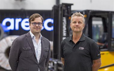 På bild: Jonathan Fyhr VD för Areco Steel Service Center (SSC) och David Tkaczyk, representant Ottosson Truck/Hyundai i Skåne.