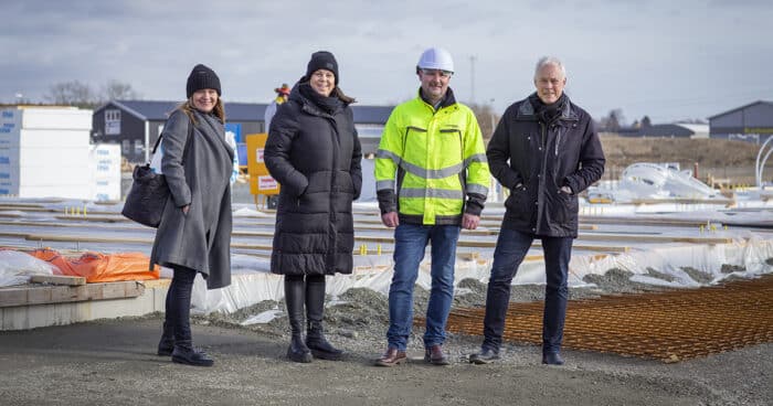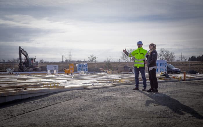 Bengt och Pernilla från Ottosson Truck ser ut över grunden och först nu ser man konturerna ta form för det som kommer att utgöra den del som kommer att synas ut mot väg E22. Visionen är stora fönster som exponerar de gula truckarna ut mot vägen men också ett showroom där kunderna skall känna sig välkomna att slå sig ner i den tänkta ”launch” hörnan och ta sig en god kopp kaffe.