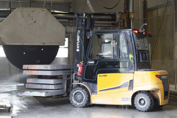 På företaget finns det sju truckar med lyftkapacitet på 2 till 18 ton som används efter behov beroende på stenblockens storlek. Frida sköter det största delen med ”sin” truck, en Hyundai 50-B-9 som har en lyftkapacitet på 5 ton.