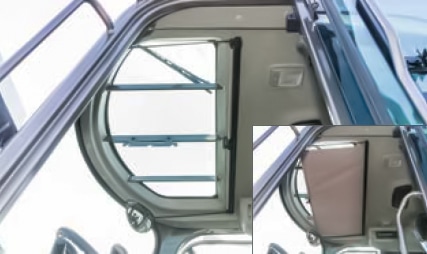 Den främre vindrutan har en ny, välvd design som skapar en fantastisk sikt för föraren. Dubbla vindrutetorkare tar bort vatten från en större del av framrutan.