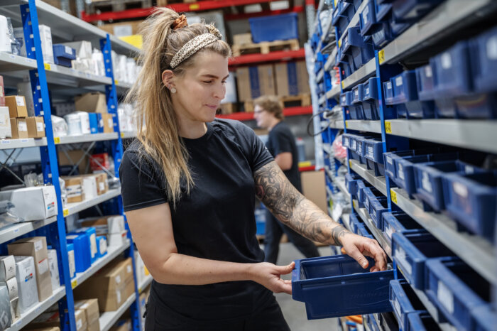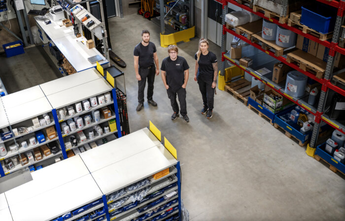 – När vi byggde nytt låg fokus på ergonomi och arbetsmiljö för att alla skulle kunna arbeta här. Lagerautomaten är en del av det och gör att vi kan stå i rätt arbetshöjd när vi plockar reservdelar, säger Timmie.