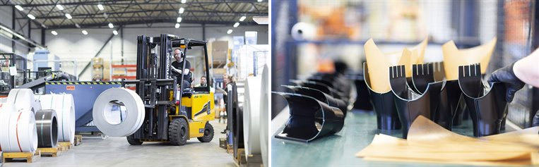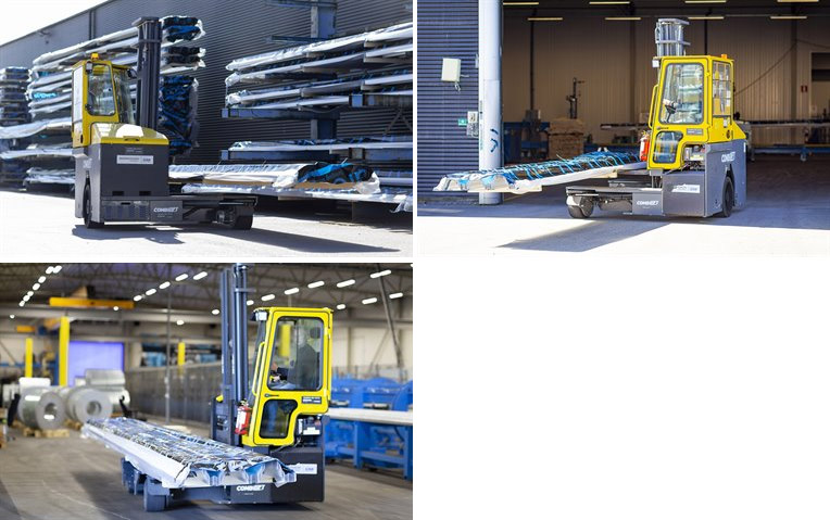 I nästa byggnad hittar vi en Comblift C 4000E som här hanterar de långa korrugerade tak-, och fasadprofilerna.