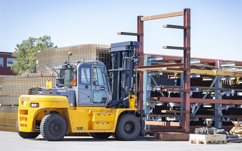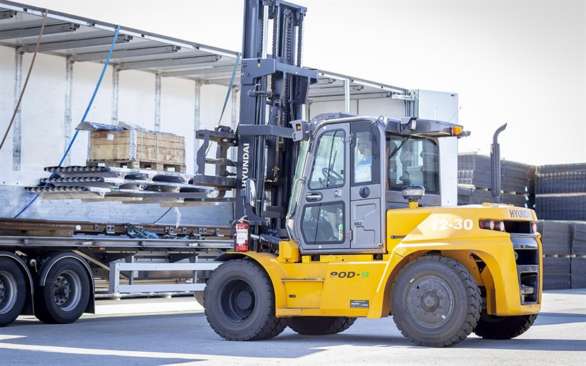 På gården är en Hyundai 80D-9 i full gång att lasta av en långtradare och under vårt besök så rör sig denna truck konstant med lastning och lossning och med att förflytta det tunga materialet över den stora produktionsanläggningen.