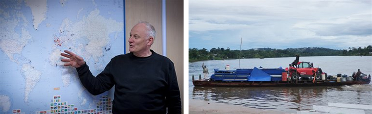 Naturligtvis får vi även höra fantastiska historier om hur det är att leverera och installera dessa stora tunga maskiner till platser som ibland inte ens har vägar, utan som måste levereras i delar på så kallade piroger när vattnet har rätt höjd mellan regn och torrperiod för att kunna transportera delarna som till exempel i Franska Guyana. Eller när de behövde lösa ett problem med reservdelar till Maldiverna snabbt. Det löstes med att erbjuda en student resa + en vecka på resort efter leveransen. Alla var nöjda.