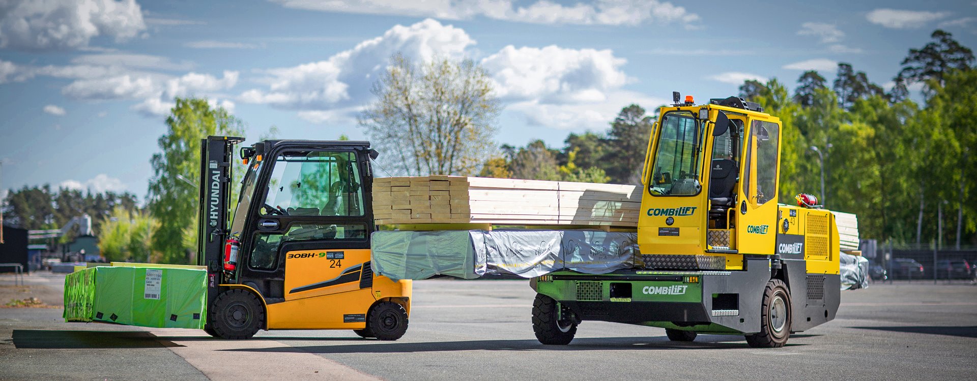 På Svensk Husproduktionen används Combiliften till många olika saker såsom att transportera långa virkespaket på upp till 15 m, till långa husväggspaneler, takstolar mm.