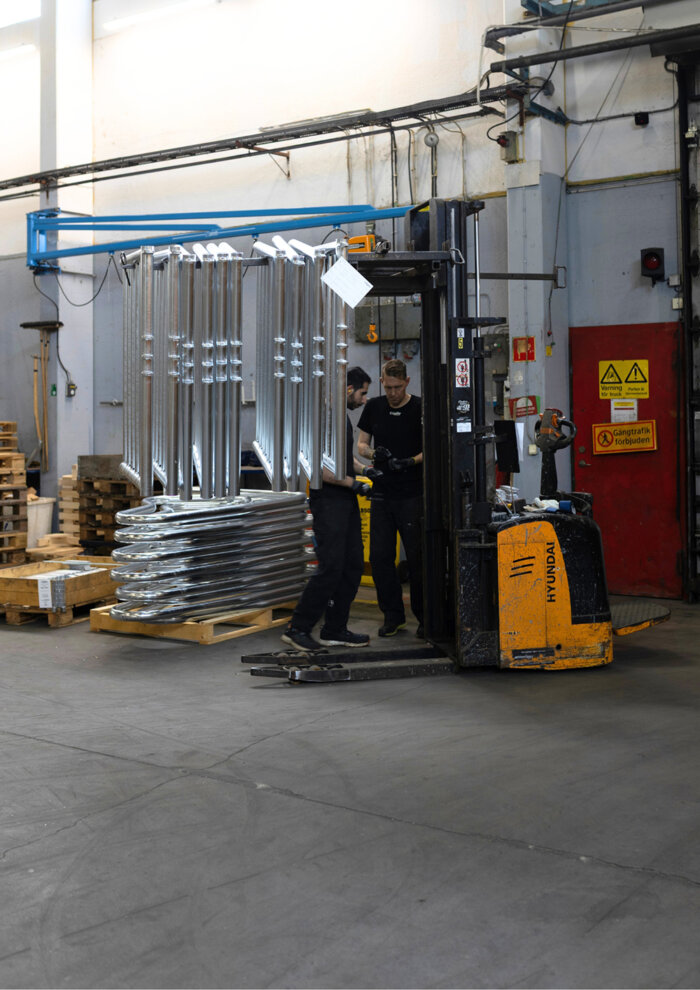 En annan viktig del i Smekab Citylifes produktion är hanteringen av stora stålmallar och långa stålrör. För det används en Combilift CB2000E med sidolastfunktion för att kunna lasta gods som är upp till 6 meter långa, också den från Ottosson Truck.