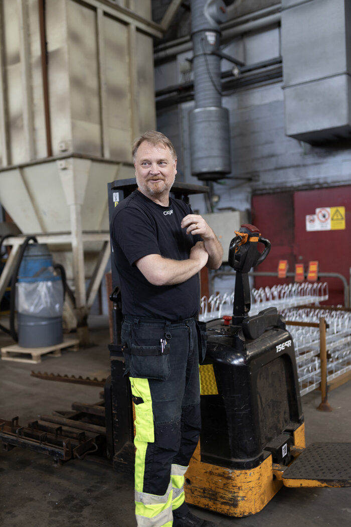 I produktionen används flera olika truckmodeller. Från handtruckar till specialbyggda maskiner.