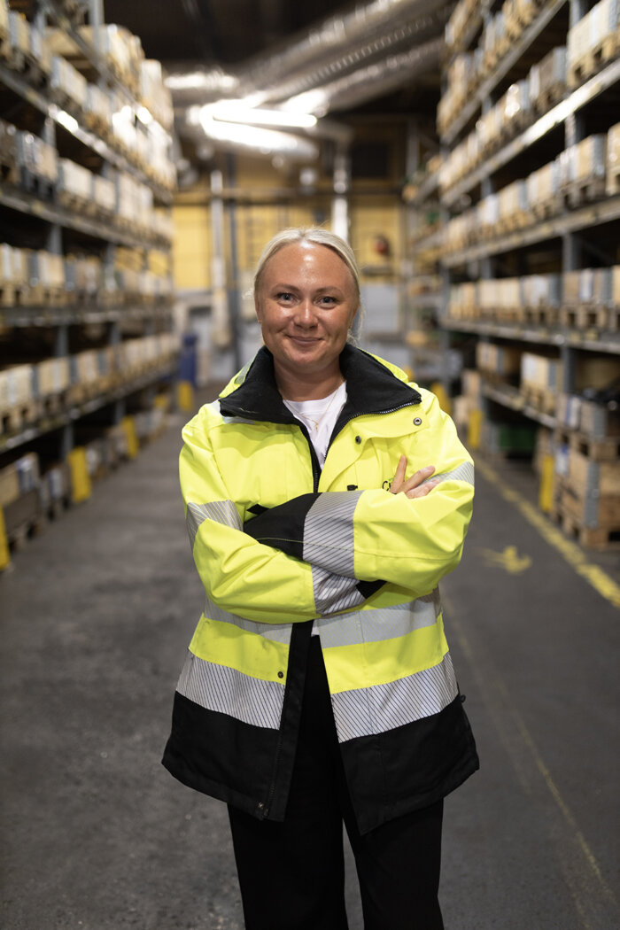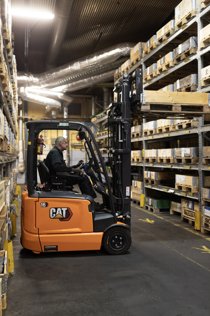 – Ledstaplaren använder jag för att lyfta från våra lager på pallställ och förbereder arbetsplatserna, berättar Katarina Fogelström. Hon använder sig av en CAT NSP12N3 som hjälper med de tunga lyften och framkörningen av material.