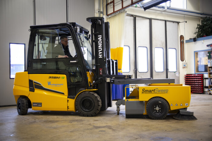 Bildtext: I samband med leveransen av en ny eltruck, en Hyundai 35BH-9, till Wendesgymnasiet i Kristianstad passade vi på att träffa Lukas Boberg (Yrkeslärare), Hans-Åke Tuomaala (förstelärare), Joakim Sahlin (Rektor) och Thindra Persson, som är elev på skolan. Även Ottosson Trucks säljare, Anton Håkansson, medverkade på bilden.